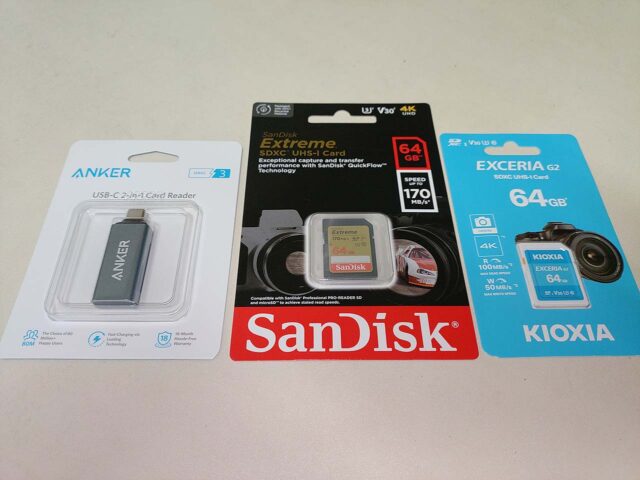 さて。10年ぶりの SD カード買い換えということで、規格を HC から XC に更新することにしました。とはいえ、32GB でも余裕があったので、容量は同規格最小の 64GB。どうせだからメーカー違い/色違いにして、K-S2 には SanDisk 製、K-S1 には KIOXIA 製をあてがいました。そして、K10D には既存の 32GB、FT-3 に Eye-Fi 8GB を割り振って、残りの 16GB と 8GB を予備ケースにしまい、ハイおしまい。
