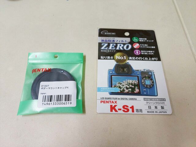 さらに、K-S1 についてこなかった純正ボディマウントキャップを購入(これまた久しぶり)。また、なんとなく K-S1 の取り扱いが雑になりそう(無頓着にカバンとかに放り込みそう)な気がしたので、デジカメ用としては初めて、液晶保護フィルムを購入。まだ専用品が販売されているものだなぁ、と感心してみたり。