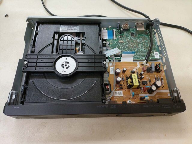 プロジェクター投影用として3月に購入したブルーレイ・プレイヤー DBP-S600 のディスクトレイが、先日、急に開かなくなりまして。開閉ボタンを押した時の動作音からして、光学ディスク機器でありがちな、開閉用ベルトの問題ぽいので、そそくさとネットで情報を集めて修理することにしました。
