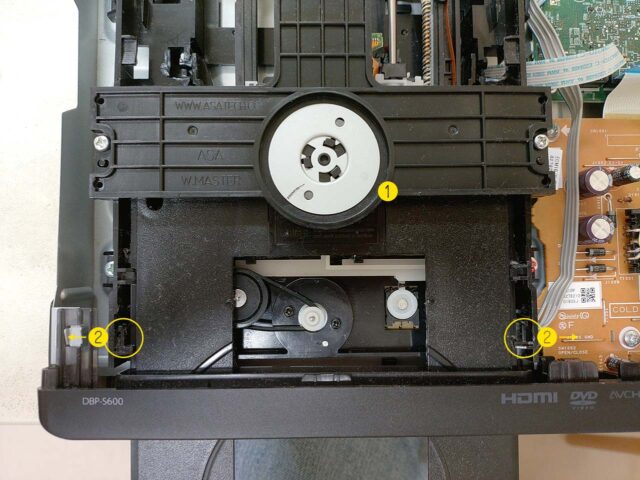ネット上の情報によると、トレイ開閉用プーリーにかかっているベルトがヤれてくると、ドライブの上側中央のブリッジ部分(❶)とトレイをロックしている磁力に負け、ベルトが空回りして、トレイが排出されなくなるらしい。そして、そのベルトを交換する際には、トレイを完全に取り外す必要があるよ、と。