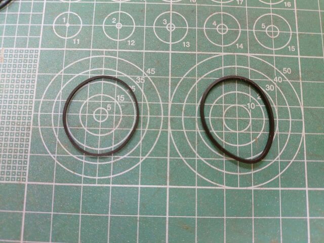 プーリーにかけられたベルトを外し、ざっと調べてみたところ、太さ約 1.5mm、外径 30mm ほど。手持ちのベルトから、内径が似たようなブツをピックアップ。プーリー2点を無水エタノールをつけた綿棒で清掃し、新しいベルトを装着。