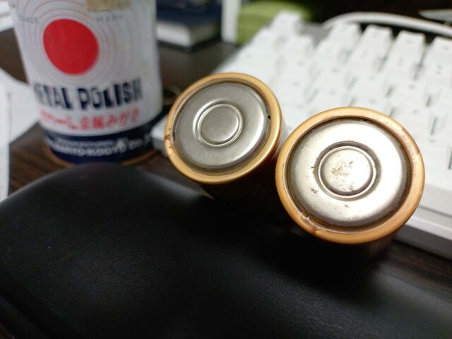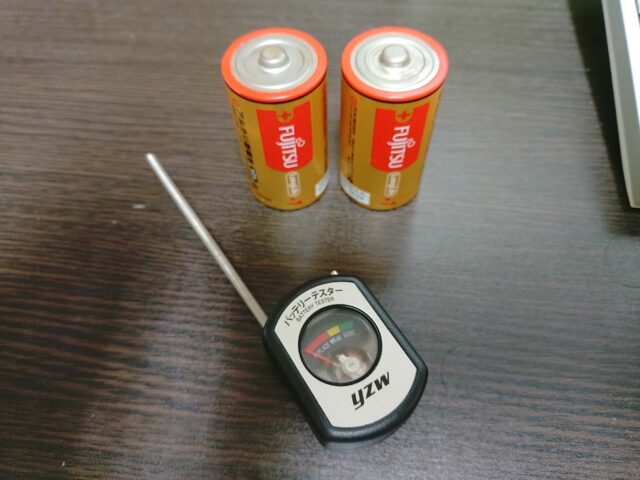 これはあれだ。接点が汚れて接触不良を起こしているに違いないと、乾電池の両極をピカールで軽く磨いてみたのです。そうしたら、針の揺らぎは収まり、GOOD と WEAK の境界あたりを指しました。