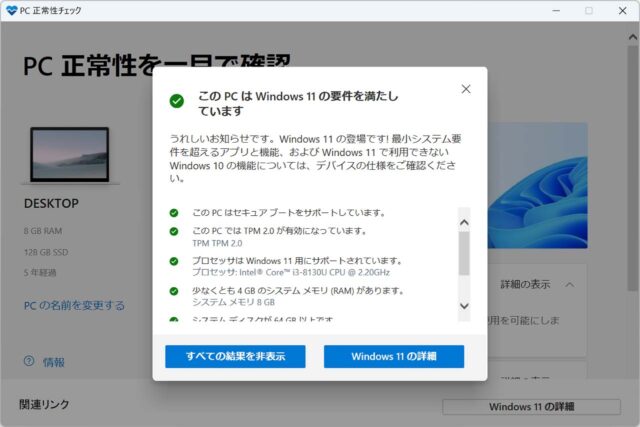 その結果は「この PC は Windows 11 の要件を満たしています」。だからよ。
